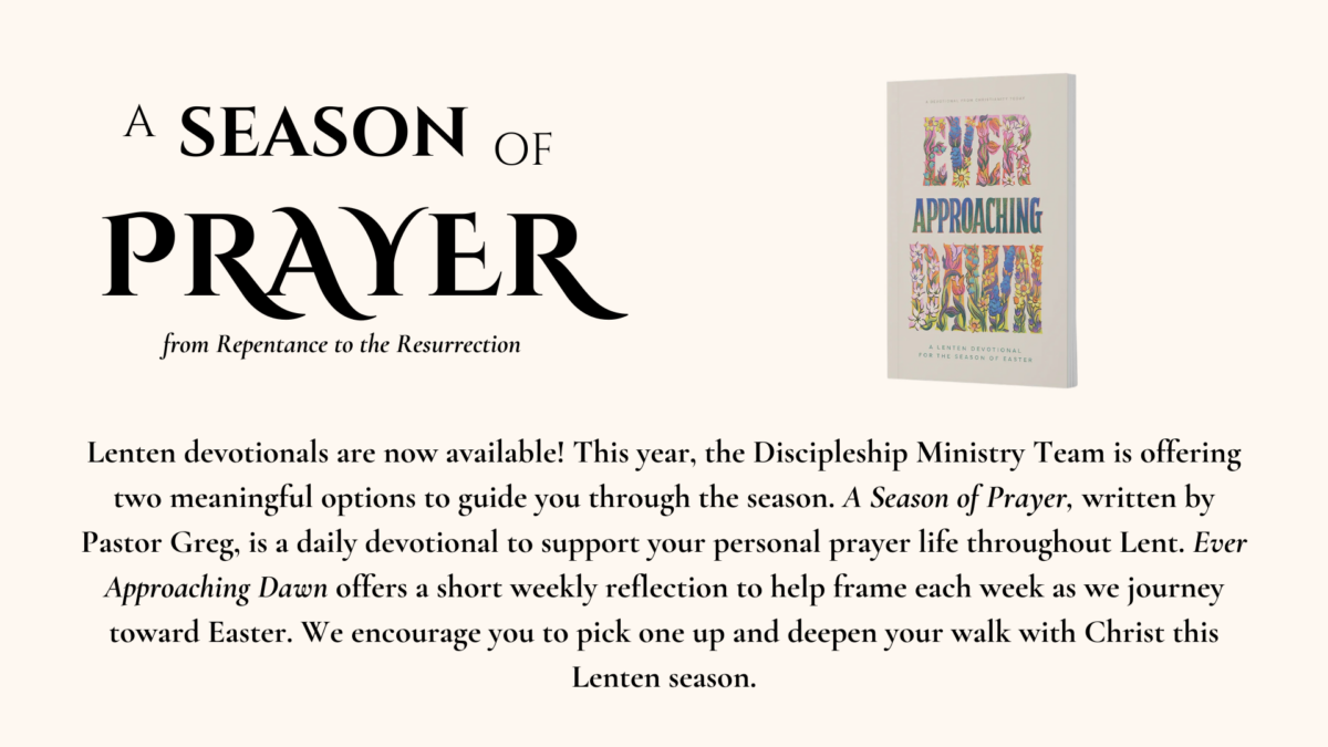 Lenten devotionals are now available! This year, the Discipleship Ministry Team is offering two meaningful options to guide you through the season. A Season of Prayer, written by Pastor Greg, is a daily devotional to support your personal prayer life throughout Lent. Ever Approaching Dawn offers a short weekly reflection to help frame each week as we journey toward Easter. We encourage you to pick one up and deepen your walk with Christ this Lenten season.